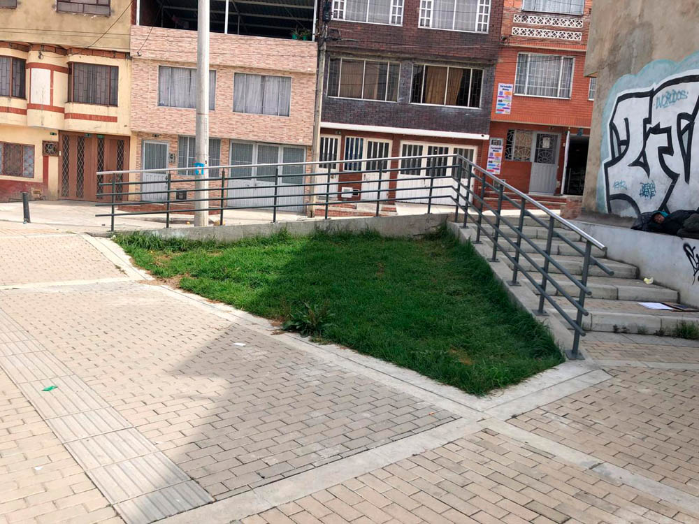 Parales en tubería metálica de 1-1/2″, pasamanos en tubería de 2″ de acero inoxidable, travesaños intermedios en tubo metálico de 1-1/2″, de apoyo pasamanos en platina de 1/4″.