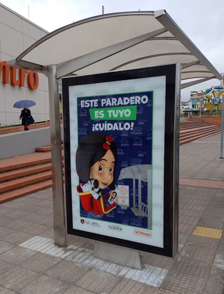 Mupi para fijación a piso y dos caras de exhibición de publicidad para uso enlugares exteriores, protección en vidrio templado por ambas caras, el áreaefectiva de la publicidad es de 70 x 125 cm