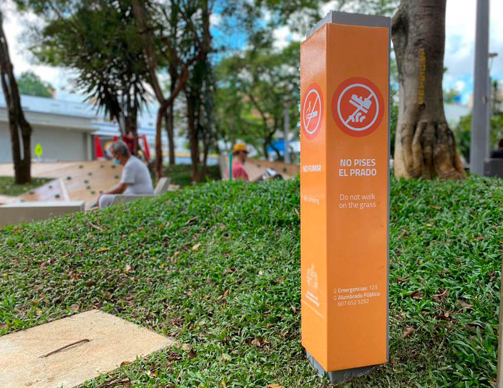 Lamina Hot Rolled doblada en forma de tubo cuadrado de espesor 2.5 mm, placa base, en lamina Hot Rolled de 1/8, información señalética en adhesivo impresión digital.